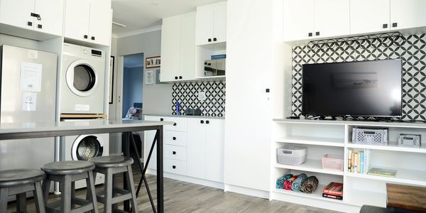 The open-plan living area features a fully equipped kitchen, washer and dryer, and a cozy lounge with full DSTV.